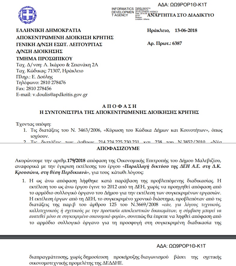 Το 2012 ο δήμος Μαλεβιζίου ανέθεσε απευθείας στη ΔΕΗ την εκτέλεση του έργου «Παραλλαγή δικτύου της ΔΕΗ Α.Ε. στη Δ.Κ. Κρουσώνα, στη θέση Περδικιανά», χωρίς όμως να ληφθεί καμιά νόμιμη απόφαση! Το έργο ήταν στον “αέρα” και 6 χρόνια μετά, το 2018, η Οικονομική Επιτροπή πήρε απόφαση για την… ανάθεση και την εκτέλεσή του, που φυσικά είναι παράνομη!