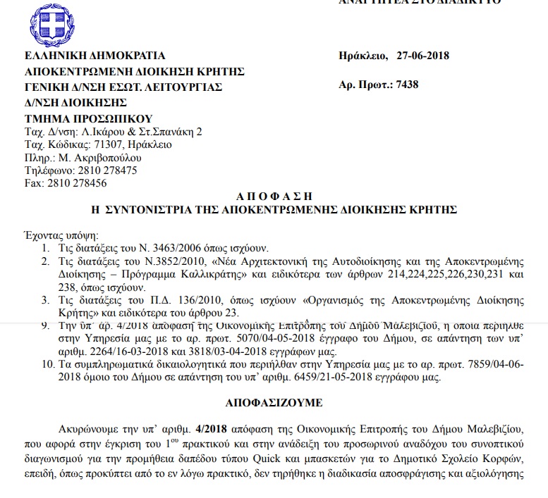 διαγωνισµού για την προµήθεια δαπέδου τύπου Quick και µπασκετών για το ∆ηµοτικό Σχολείο Κορφών, απόφαση η οποία επίσης ακυρώθηκε καθώς, όπως αναφέρει η Αποκεντρωμένη,