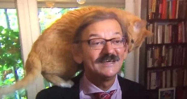 Ο καθηγητής Γιέρζι Ταργκάλσκι έδινε μια συνέντευξη σχετικά με τις πολιτικές εξελίξεις, όταν η χαριτωμένη γάτα του απόφάσισε ότι ήταν η στιγμή να… γίνει διάσημη και σκαρφάλωσε στο κεφάλι του αφεντικού της, ο οποίος συνέχισε κανονικά να μιλάει χωρίς να διακόψει.