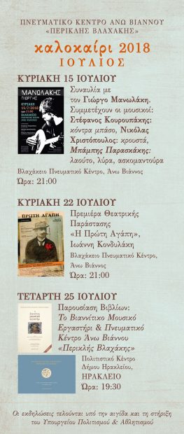 Ανακοινώθηκαν από το Πνευματικό Κέντρο Άνω Βιάννου «Περικλής Βλαχάκης» οι εκδηλώσεις για τον Ιούλιο του 2018.