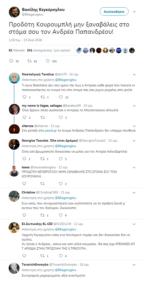 “Προδότη Κουρουμπλή μην ξαναβάλεις στο στόμα σου τον Ανδρέα Παπανδρέου!”, έγραψε ο Β. Κεγκέρογλου στο twitter, με αφορμή τη δήλωση του Π. Κουρουμπλή ότι και ο Ανδρέας Παπανδρέου την ίδια συμφωνία με τον Α. Τσίπρα θα υπέγραψε με τα Σκόπια.