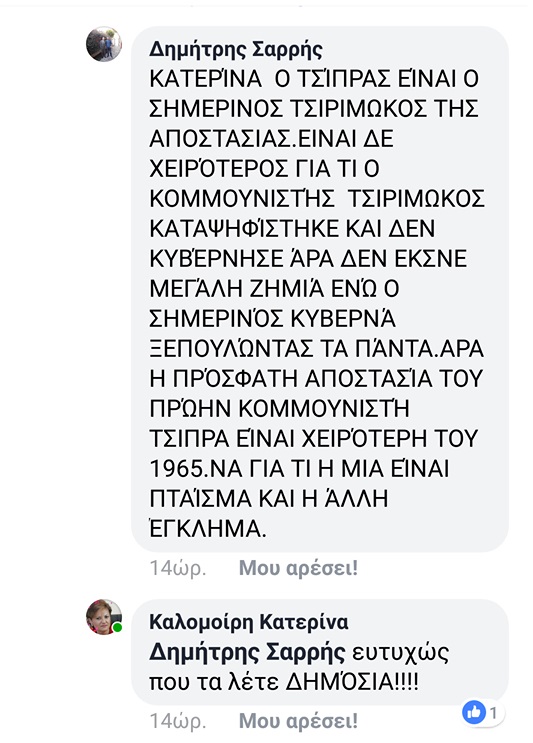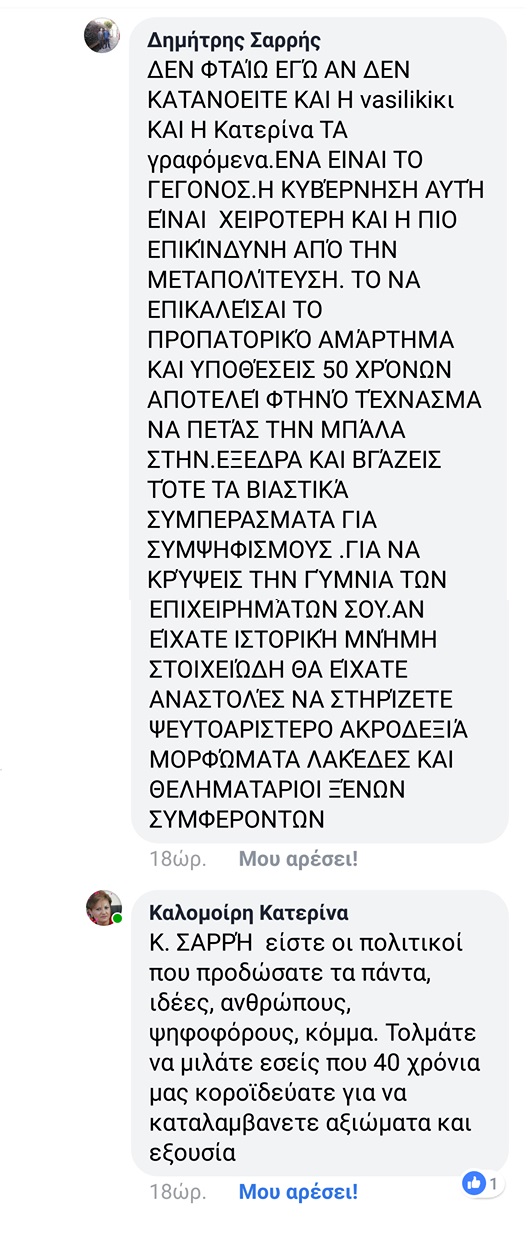 Από την άλλη, ο άλλοτε βουλευτής, για χρόνια υπουργός και νομάρχης Ηρακλείου, Δ. Σαρρής, δε διστάζει να αποκαλέσει “προδότη” και “Τσιριμώκο” τον Αλέξη Τσίπρα και να μιλήσει για “προδοσία” της αριστεράς, που δεν συγκρίνεται, μάλιστα, με την αποστασία του 1965, η οποία οδήγησε στη χούντα και στην τραγωδία της Κύπρου! Ο κ. Σαρρής δεν διστάσει επίσης να χαρακτηρίσει “χρυσαυγίτες” τοπικά στελέχη του ΣΥΡΙΖΑ όταν αυτά “τολμούν” να απαντήσουν στα ανιστόρητα γραφόμενά του!