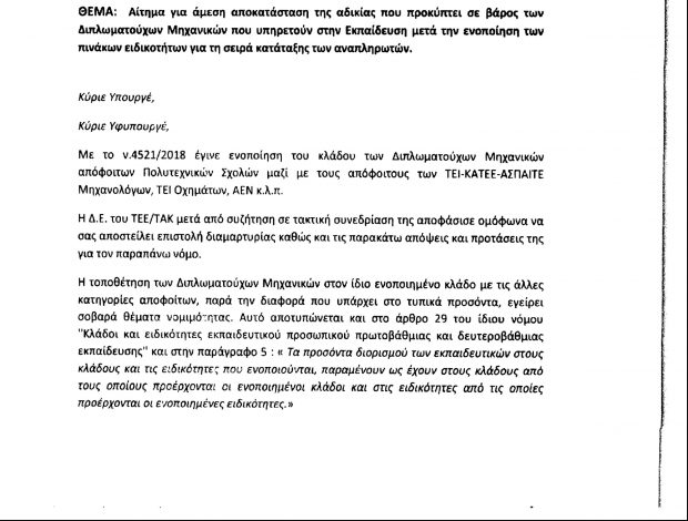 Επιστολή προς τον Υπουργό Παιδείας, Έρευνας και Θρησκευμάτων, κ. Γαβρόγλου, τον Υφυπουργό Παιδείας, κ. Μπαξεβανάκη και το Ινστιτούτο Εκπαιδευτικής Πολιτικής απέστειλε το ΤΕΕ/ΤΑΚ, μέσω της οποίας ζητά την άμεση αποκατάσταση της αδικίας που προκύπτει σε βάρος των Διπλωματούχων Μηχανικών που υπηρετούν στην εκπαίδευση, μετά την ενοποίηση των πινάκων ειδικοτήτων για τη σειρά κατάταξης των αναπληρωτών.
