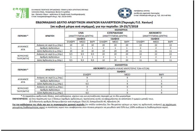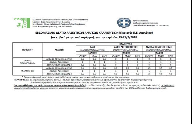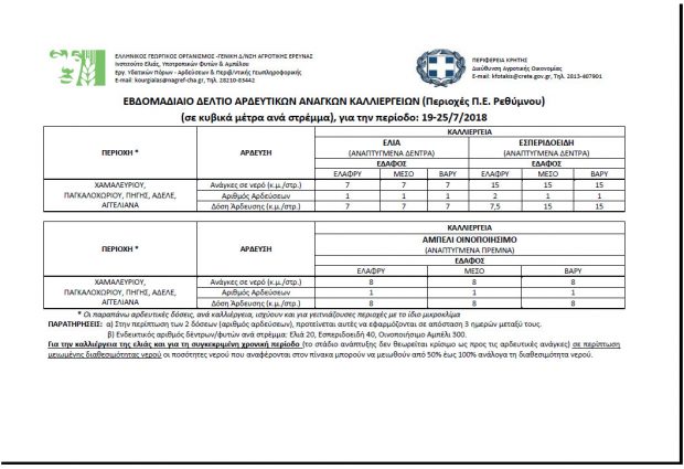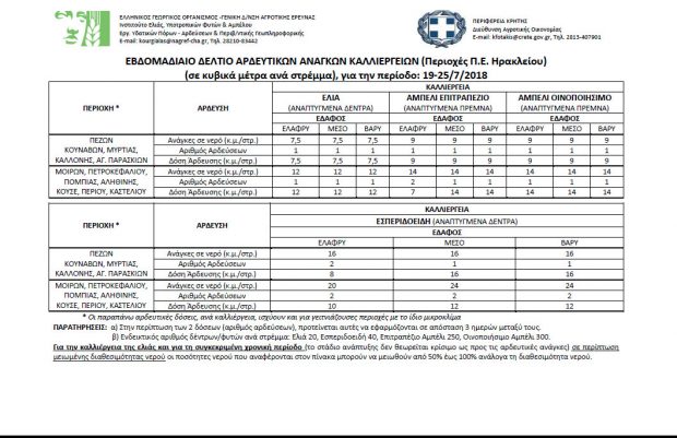 Ανακοίνωση εξέδωσε η Διεύθυνση Αγροτικής Οικονομίας της Περιφέρειας Κρήτης, μέσω της οποίας παρουσιάζει τα αρδευτικά δελτία και των τεσσάρων νομών της Κρήτης για την εβδομάδα από 19/07 έως 25/07/2018.