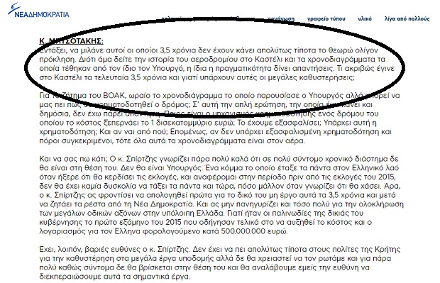 “Εντάξει, να μιλάνε αυτοί οι οποίοι 3,5 χρόνια δεν έχουν κάνει απολύτως τίποτα το θεωρώ ολίγον πρόκληση. Διότι άμα δείτε την ιστορία του αεροδρομίου στο Καστέλι και τα χρονοδιαγράμματα τα οποία τέθηκαν από τον ίδιο τον Υπουργό, η ίδια η πραγματικότητα δίνει απαντήσεις. Τι ακριβώς έγινε στο Καστέλι τα τελευταία 3,5 χρόνια και γιατί υπάρχουν αυτές οι μεγάλες καθυστερήσεις;