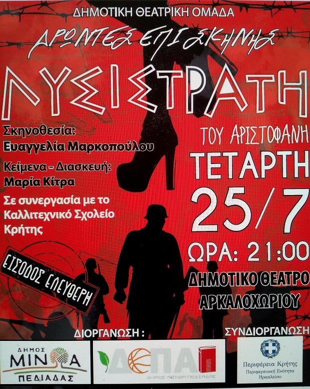 Η δημοτική θεατρική ομάδα του Δήμου Μινώα Πεδιάδας, «Δρώντες επί σκηνής» σε συνεργασία με το καλλιτεχνικό σχολείο Ηρακλείου παρουσιάζει το έργο του Αριστοφάνη “ΛΥΣΙΣΤΡΑΤΗ”. Μια κωμωδία που γράφτηκε και διδάχτηκε το 411 π.Χ και χαρακτηρίζεται ένα από τα παλαιότερα και χαρακτηριστικότερα αντιπολεμικά έργα. Η πρεμιέρα του έργου θα γίνει την Τετάρτη 25 Ιουλίου στο Δημοτικό Θέατρο Αρκαλοχωρίου στις 21:00 και θα γίνουν επίσης παραστάσεις: