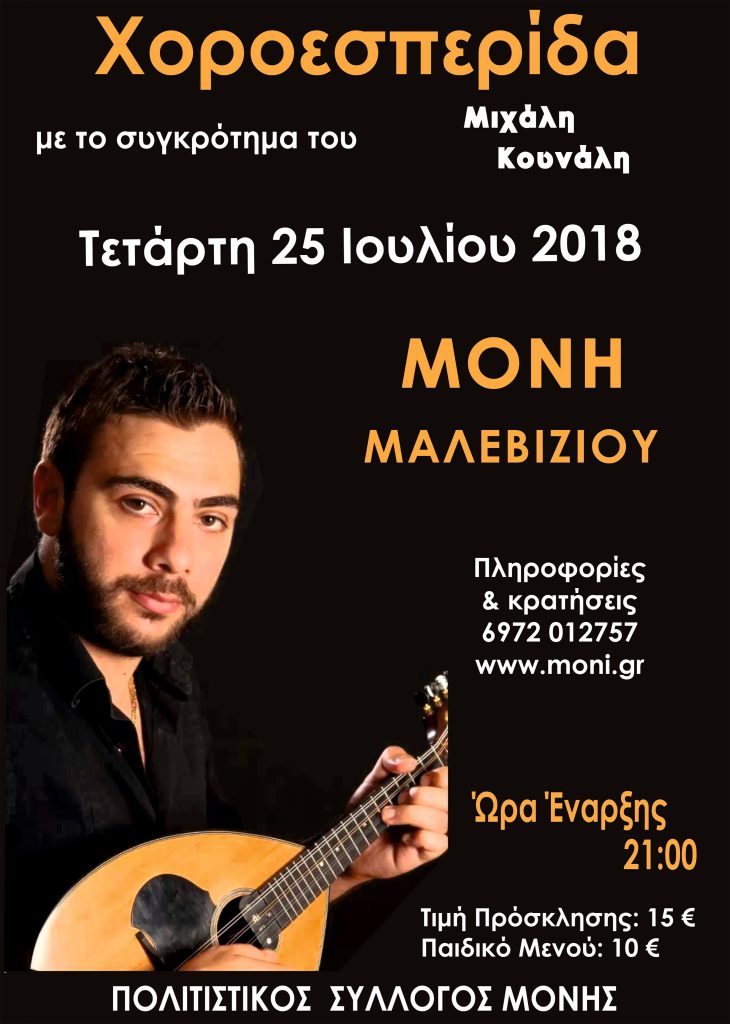 Ο πολιτιστικός σύλλογος Μονής Μαλεβιζίου σας προσκαλεί στην ετήσια χοροεσπερίδα που διοργανώνει με το συγκρότημα του Μιχάλη Κουνάλη , στην πλατεία της Μονής την Τετάρτη 25 Ιουλίου 2018, παραμονή της Αγίας Παρασκευής που είναι πολιούχος του χωριού.