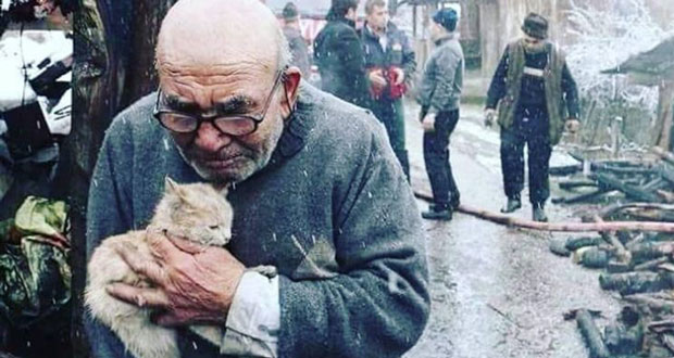 Η φωτογραφία που κυκλοφόρησε περισσότερο δείχνει έναν ηλικιωμένο κύριο που κρατάει ένα γατάκι μπροστά από ένα καμένο σπίτι ενώ… χιονίζει. Το γεγονός ότι φοράει χειμωνιάτικα ρούχα δεν φάνηκε να προβληματίζει και πολλούς.