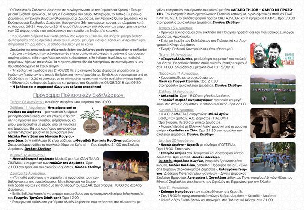 - Ενημερωτική εκδήλωση για θέματα οδικής Ασφάλειας που εντάσσεται στα πλαίσια της μεγάλης εκστρατείας ενημέρωσης του κοινού με τίτλο «ΑΓΑΠΩ ΤΗ ΖΩΗ – ΟΔΗΓΩ ΜΕ ΠΡΟΣΟΧΗ». Ώρα: 20:30 στο προαύλιο του σχολείου Δαμάστας. Είσοδος: Eλεύθερη