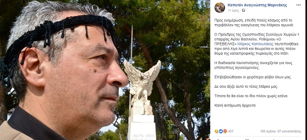Συγγενικό του πρόσωπο, ο Αναγνώστης Μαρινάκης, με ανάρτησή του στο facebook έκανε γνωστό ότι ταυτοποιήθηκε πως είναι ένας από τους νεκρούς, ενώ ήδη η σελίδα του Μάρκου Κατσουλάκη κατακλύζεται από μηνύματα θλίψης φίλων του.