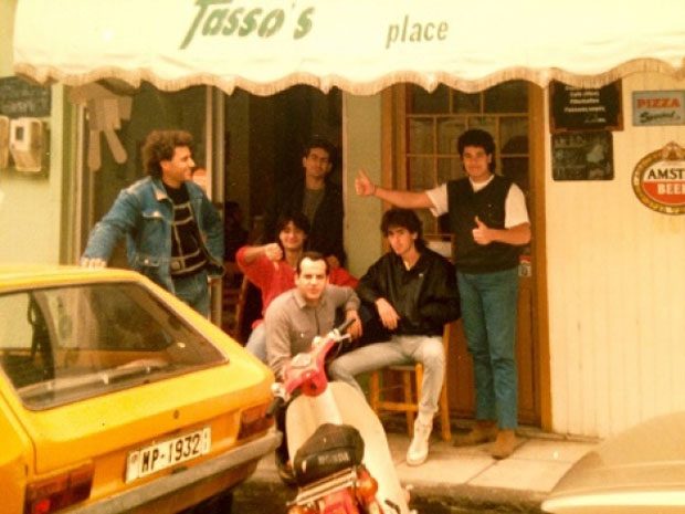 Η φωτογραφία που βλέπουμε είναι από το αρχείο του Γιάννη Σαρχιανάκη, κάπου στις αρχές του 1990. Μια παρέα νέων της εποχής, ανάμεσά τους και ο Γιάννης (καθιστός με το μαύρο δερμάτινο) κάθονται έξω από το Tassos Place. Ακριβώς μπροστά τους είναι παρκαρισμένο ένα μηχανάκι και ένα αυτοκίνητο, καθώς , όπως είπαμε τότε η Χάνδακος δεν ήταν πεζόδρομος! Είχε χώρο και για να παρκάρουμε και για να περνάνε αυτοκίνητα.