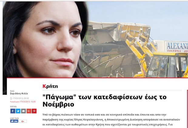 Ήταν Μάρτιος του 2013. Η Όλγα Κεφαλογιάννη ήταν υπουργός Τουρισμού της συγκυβέρνησης Σαμαρά- Βενιζέλου. Στην Κρήτη, σε εφαρμογή πρωτοκόλλων κατεδάφισης που εκκρεμούσαν επί χρόνια, είχαν ξηλωθεί τμήματα δυο ξενοδοχείων. Και ενώ στο πρόγραμμα υπήρχαν άλλες 80 κατεδαφίσεις, αυτές ουδέποτε έγιναν, καθώς αντέδρασε έντονα η υπουργός Τουρισμού και στέλεχος της ΝΔ!