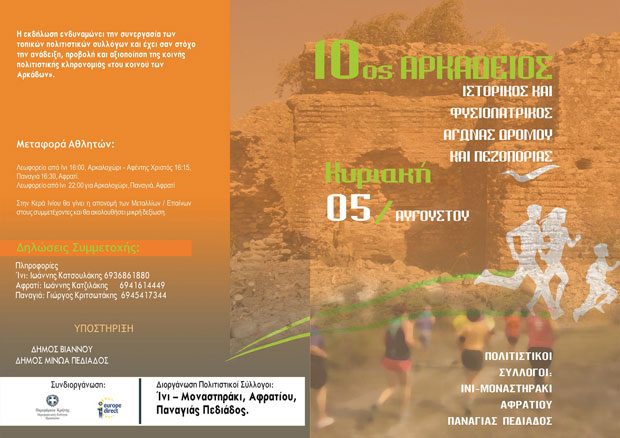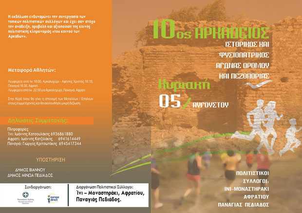 Για 10η συνεχόμενη χρονιά διοργανώνεται, την Κυριακή 5Αυγούστου, ο «Αρκάδειος Ιστορικός και Φυσιολατρικός Αγώνας Δρόμου & Πεζοπορίας», από τους πολιτιστικούς συλλόγους Ίνι – Μοναστηράκι, Αφρατίου και Παναγιάς Πεδιάδας σε συνδιοργάνωση με την Περιφέρεια Κρήτης – Περιφερειακή Ενότητα Ηρακλείου. Ο αγώνας είναι δωρεάν σε συμμετοχές σύμφωνα με του οργανωτές οι οποίοι απευθύνουν “ανοιχτό” κάλεσμα σε όλους να πάρουν μέρος δηλώνοντας την συμμετοχή τους τηλεφωνικά η με την προσωπική τους παρουσία λίγη ώρα πριν την έναρξη των αγώνων. Στο τέλος της εκδήλωσης θα υπάρξουν βραβεύσεις αλλά και κέρασμα με εδέσματα που θα έχουν παρασκευάσει γυναίκες μέλη των πολιτιστικών συλλόγων.