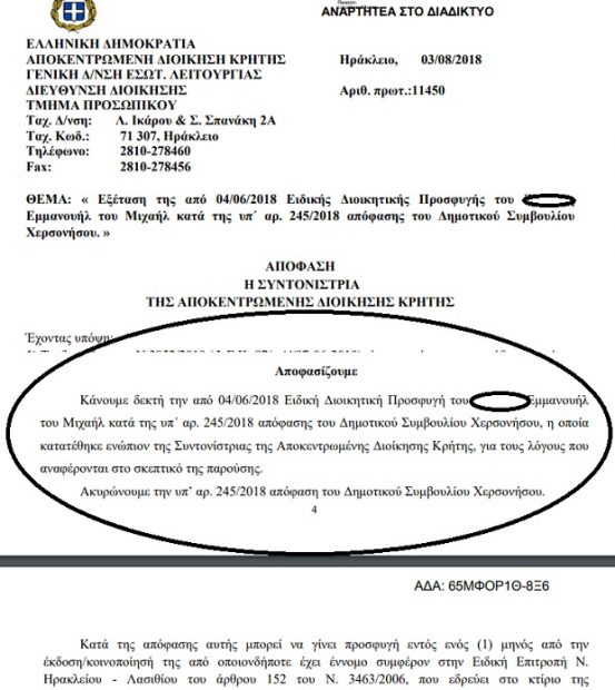 Κατά της απόφασης προσέφυγε πολίτης της περιοχής με ειδική διοικητική προσφυγή στην Αποκεντρωμένη Διοίκηση Κρήτης και πέτυχε την ακύρωσή της.
