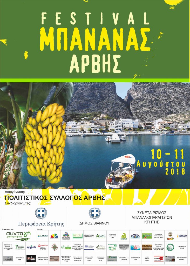 Το δεύτερο φεστιβάλ μπανάνας θα πραγματοποιηθεί στις 10 και 11 Αυγούστου στην Άρβη που οργανώνει ο πολιτιστικός σύλλογος Άρβης, με την στήριξη της Περιφέρεια Κρήτης, Δήμου Βιάννου και του Συνεταιρισμού Μπανανοπαραγωγών Κρήτης. Το πρόγραμμα του φεστιβάλ: