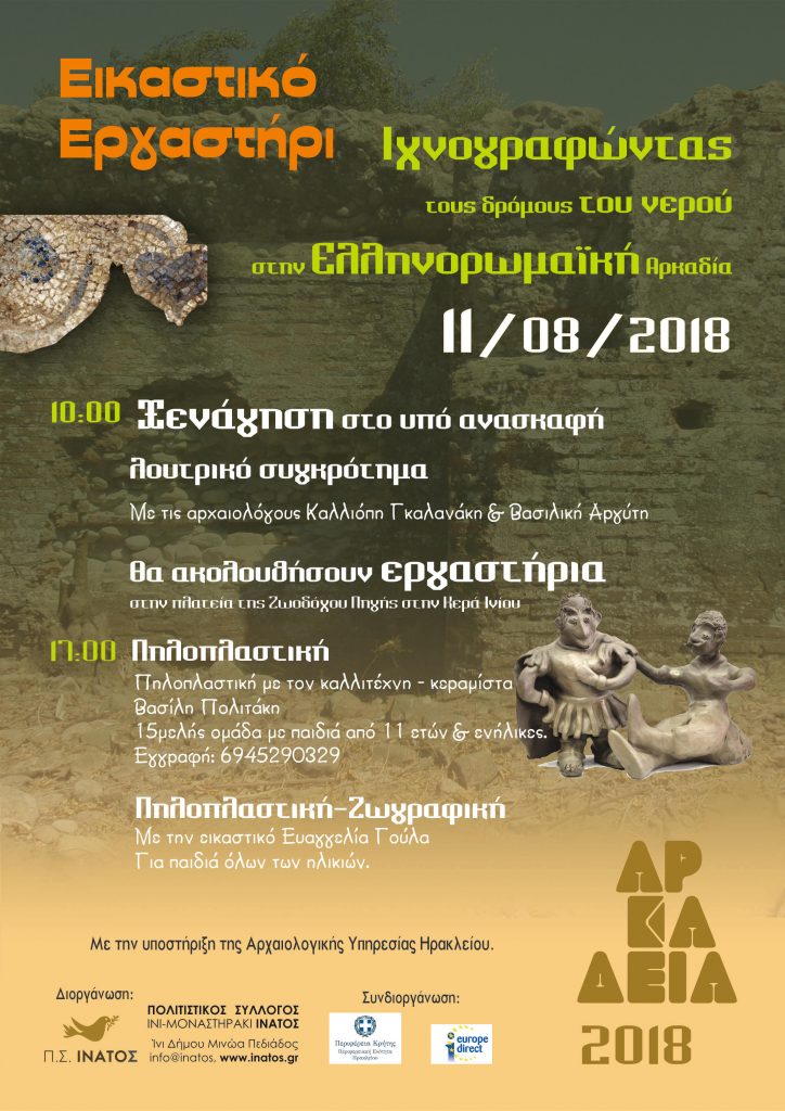 Με τίτλο «ιχνογραφώντας τους δρόμους του νερού στην ελληνορωμαϊκή Αρκαδία» ο Πολιτιστικός Σύλλογος Ίνι Μοναστηράκι (Ίνατος), η Περιφέρεια Κρήτης – Π.Ε. Ηρακλείου, το Europe Direct και η Αρχαιολογική Υπηρεσία Ηρακλείου, απευθύνουν ανοικτό κάλεσμα στην ξενάγηση στην αρχαία Αρκαδία και στις παράλληλες εκδηλώσεις που θα πραγματοποιηθούν το Σάββατο 11 Αυγούστου 2018.