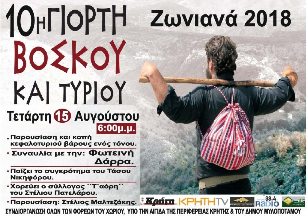 Η 10Η γιορτή «Βοσκού και Τυριού» θα πραγματοποιηθεί την Τετάρτη 15 Αυγούστου στις 6 το απόγευμα στα Ζωνιανά με την στήριξη της Περιφέρειας και του Δήμου Μυλοποτάμου. Πρόκειται για μια γιορτή θεσμό που χαρακτηρίζει με τον καλύτερο τρόπο τις συνήθειες των κατοίκων του χωριού, του ορεινού Μυλοποτάμου.