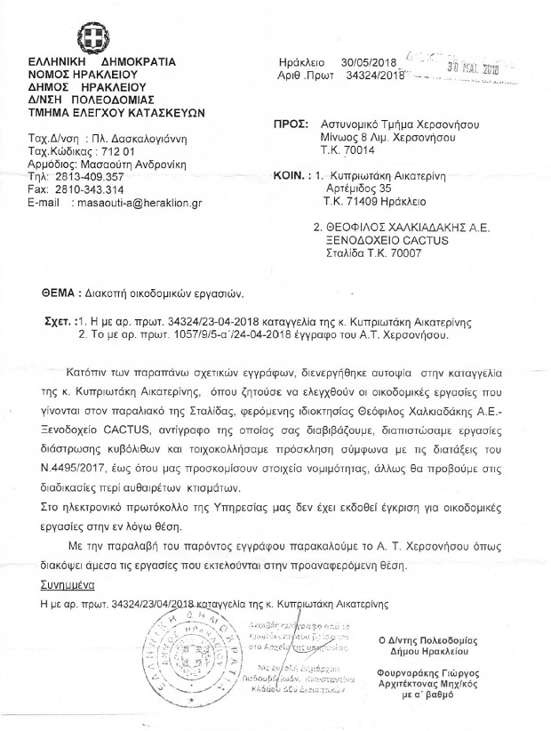 Δείτε: Παράνομη απόφαση: “Μπλόκο” της Αποκεντρωμένης στην άδεια… “αυθαίρετων εργασιών” του δήμου Χερσόνησου σε ξενοδόχο! (έγγραφο)
