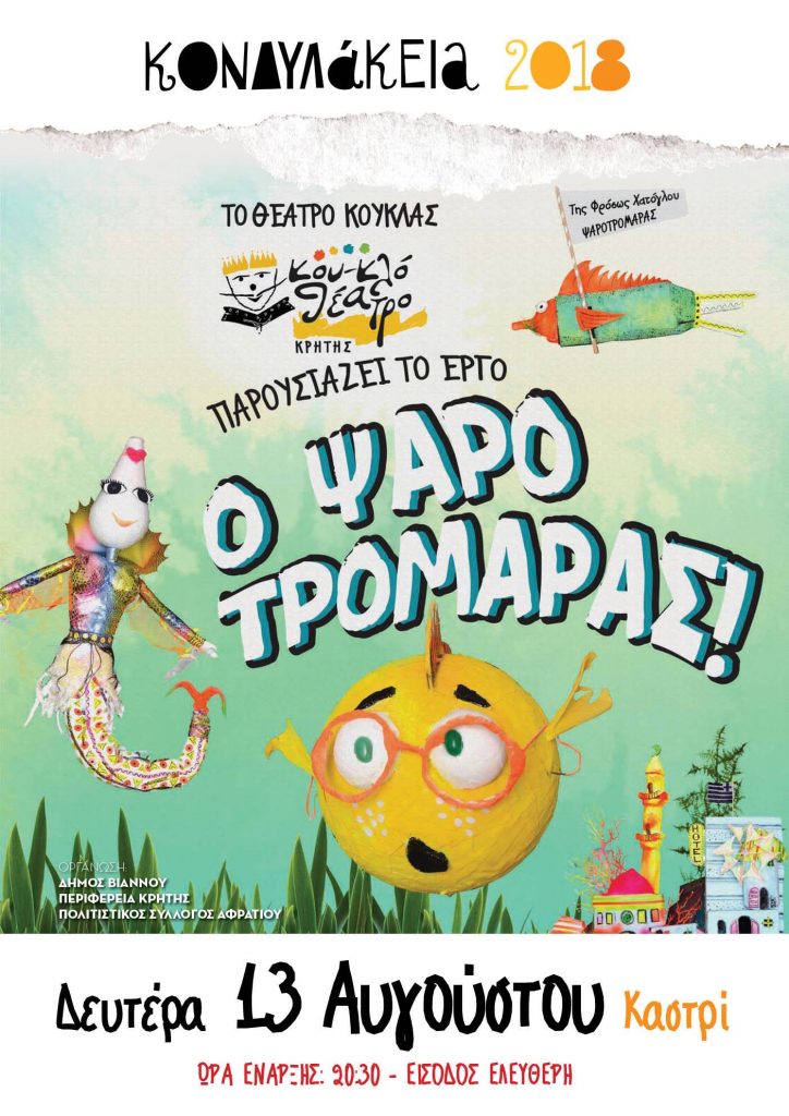 Με την γνωστή παιδική παράσταση «Ο Ψαροτρομάρας», συνεχίζονται τα ΚΟΝΔΥΛΑΚΕΙΑ 2018 από τον Δήμο Βιάννου.
