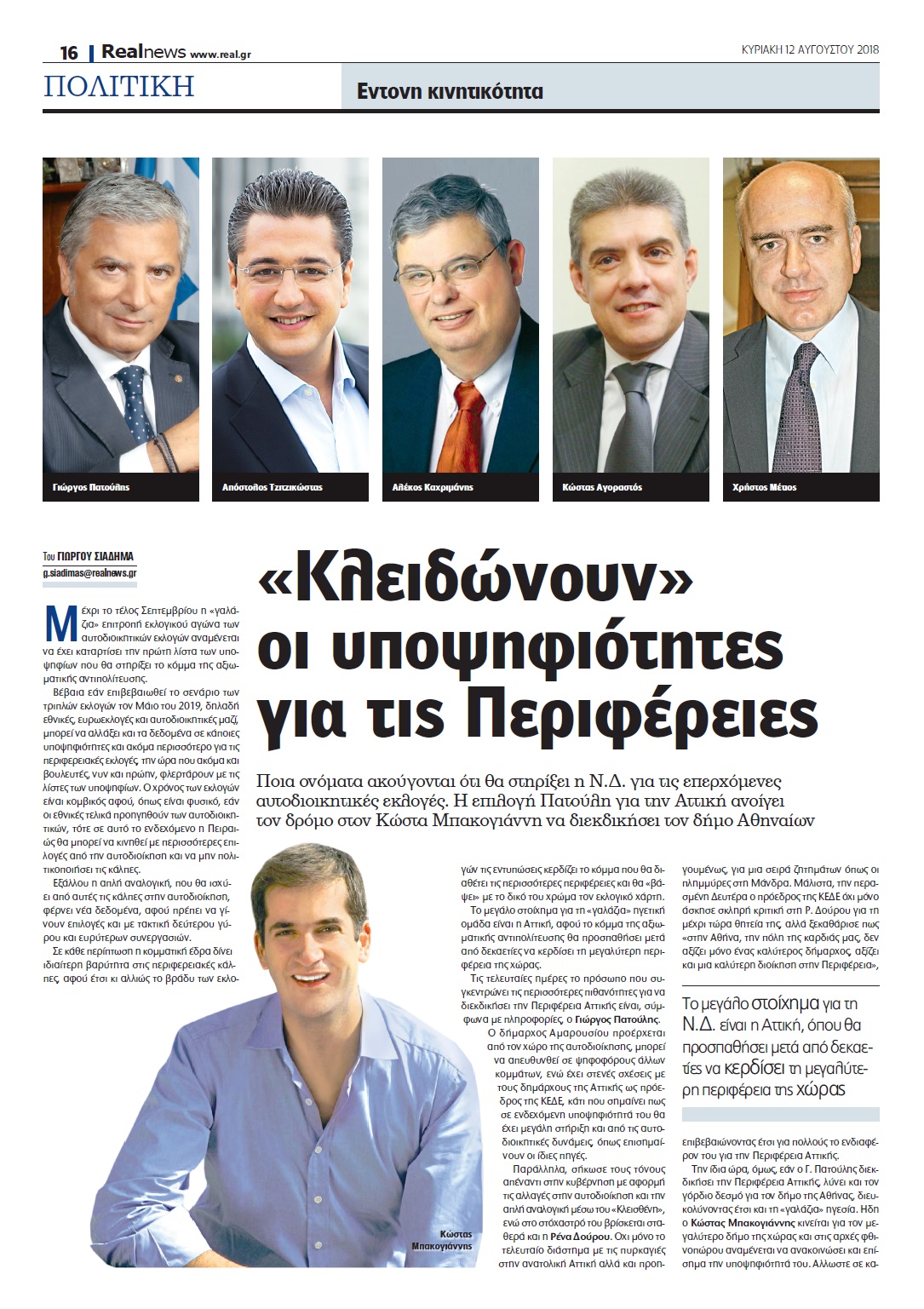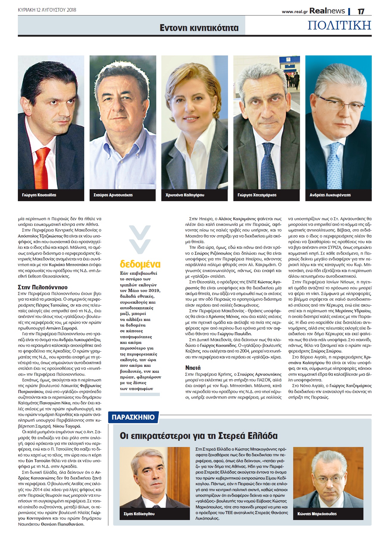 “Στην Περιφέρεια Κρήτης, ο Σταύρος Αρναουτάκης μπορεί να εκλέχτηκε με τη στήριξη του ΠΑΣΟΚ, αλλά έχει επαφή με τον Κυρ. Μητσοτάκη. Μάλιστα, κατά την περιοδεία του προέδρου της Ν.Δ. στο νησί πέρυσι, υπήρξε συνάντηση στην περιφέρεια, με πολλούς να υποστηρίζουν πως ο Στ. Αρναουτάκης θα μπορούσε να στηριχθεί από το κόμμα της αξιωματικής αντιπολίτευσης. Βέβαια, στο ενδιάμεσο και ο ίδιος ο περιφερειάρχης πλέον θα πρέπει να ξεκαθαρίσει τις προθέσεις του και να βγει απέναντι στον ΣΥΡΙΖΑ, όπως σημειώνει κομματική πηγή. Σε κάθε ενδεχόμενο, η Πειραιώς δείχνει μεγάλο ενδιαφέρον για την περιοχή λόγω και της καταγωγής του Κυρ. Μητσοτάκη, ενώ ήδη εξετάζεται και η περίπτωση άλλου πετυχημένου αυτοδιοικητικού”.