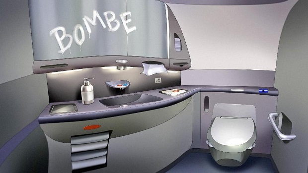 Οι επιβάτες οδηγήθηκαν όλοι μαζί σε χώρο του αεροδρομίου των Χανίων, την ώρα που έπιαναν δουλειά οι ειδικοί για να αναζητήσουν τη βόμβα. Σημειωτέον ότι η απειλή είχε εκδηλωθεί με τη λέξη “BOMBE” που είχε γραφεί σε καθρέπτη τουαλέτας του αεροσκάφους με τη χρήση σαπουνιού! Μάλιστα η Bild παρουσιάζει εικόνα που δημιούργησε στον υπολογιστή, με βάση τις μαρτυρίες επιβατών.
