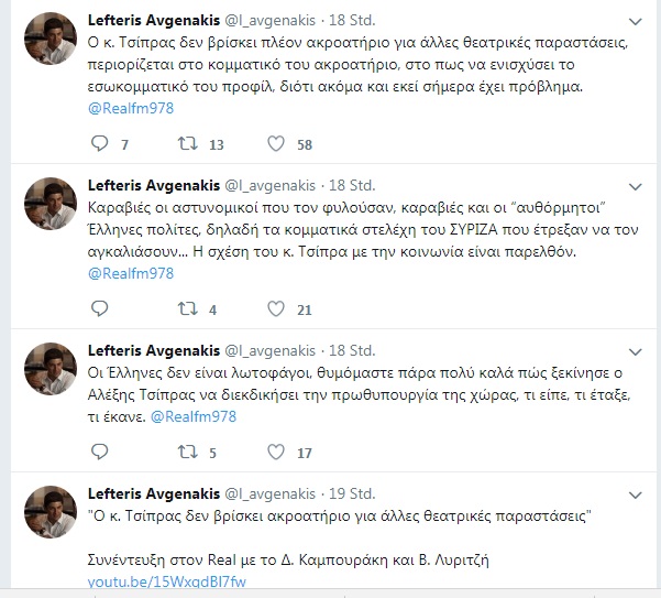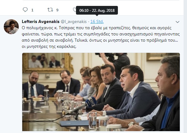 Βέβαια ενώ χαρακτηρίζει τον Τσίπρα “αφελή” ή ότι έχει αφέλεια, στο twitter σημειώνει ότι είναι πολυμήχανος! Μπορεί και να μην ξέρει τη διαφορά ανάμεσα στις δυο έννοιες!