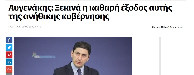 Φαίνεται ότι πόνεσε πολύ ο Λευτέρης Αυγενάκης με την έξοδο από τα μνημόνια! Και δεν το έκρυψε! Τις τελευταίες ώρες με συνεχείς αναρτήσεις του και δηλώσεις του- στις οποίες χρησιμοποιεί έναν άκρως διχαστικό λόγο, επιπέδου πεζοδρομίου- προσπαθεί να δείξει πόσο μεγάλο πόνο έχει.