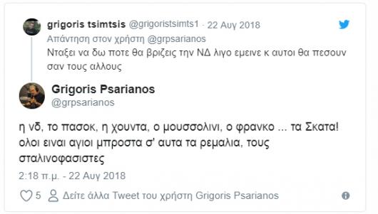 Απαντώντας σε σχόλιο στο Twitter, ο Γρ. Ψαριανός έγραψε: «Η νδ, το πασοκ, η χουντα, ο μουσσολινι, ο φρανκο … τα Σκατα! ολοι ειναι αγιοι μπροστα σ’ αυτα τα ρεμαλια, τους σταλινοφασιστες».