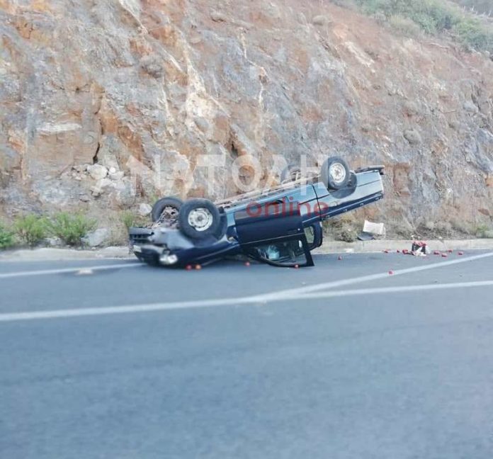 Αγροτικό αυτοκίνητο για άγνωστη μέχρι στιγμής αιτία ανατράπηκε και λίγο μετά αυτοκίνητο κινούμενο από Άγιο Νικόλαο προς Ηράκλειο φρέναρε απότομα στο σημείο του ατυχήματος με αποτέλεσμα μηχανή μεγάλου κυβισμού που ακολουθούσε να πέσει επάνω στο απότομα σταματημένο όχημα.