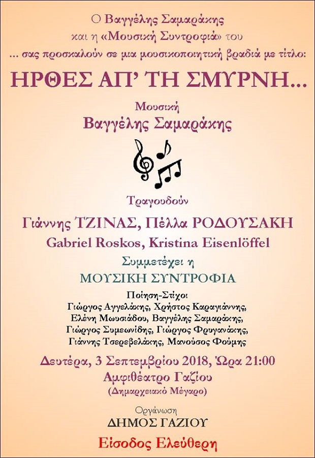 Τη Δευτέρα 3 Σεπτεμβρίου 2018, ο Βαγγέλης Σαμαράκης και η Μουσική του Συντροφιά, παρουσιάζουν μια μουσικοποιητική βραδιά με τίτλο «Ήρθες απ’ την Σμύρνη». Την μουσική γράφει ο Βαγγέλης Σαμαράκης, ενώ θα τραγουδήσουν ο Γιάννης Τζίνας, η Πέλλα Ροδουσάκη, ο Gabriel Roskos και η Kristina Eisenhoffel, τραγούδια σε ποίηση – στίχους του Γιώργου Αγγελάκη, του Χρήστου Καραγιάννη, της Ελένης Μωυσιάδου, του Βαγγέλη Σαμαράκη, του Γιώργου Συμεωνίδη, του Γιώργου Φρυγανάκη, του Γιάννη Τσερεβελάκη και του Μανούσου Φούμη.