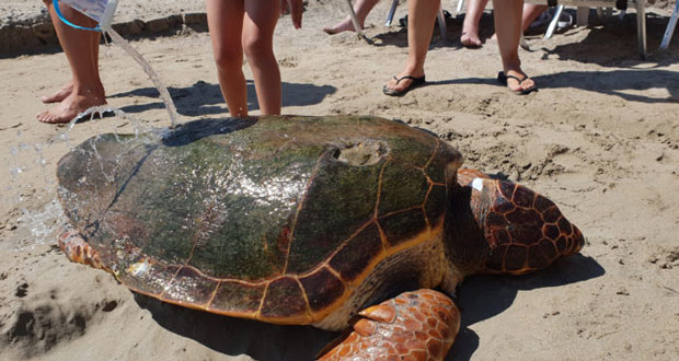 Μια μεγάλη χελώνα ξεβράστηκε στην παραλία στο Αμμούδι το πρωί του Σαββάτου.