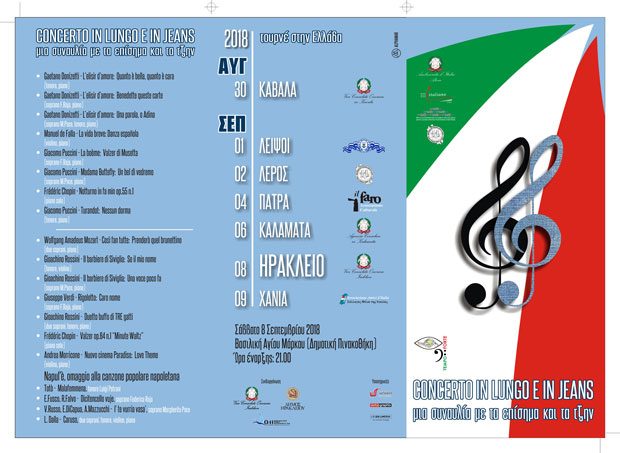Στο Ηράκλειο η εκδήλωση θα πραγματοποιηθεί το Σάββατο 8 Σεπτεμβρίου στις 21.00 στην Βασιλική Αγίου Μάρκου, με την επιμέλεια του Επίτιμου Υποπροξενείου της Ιταλίας σε συνεργασία με τον Δήμο Ηρακλείου και τον Οργανισμό Λιμένος Ηρακλείου.