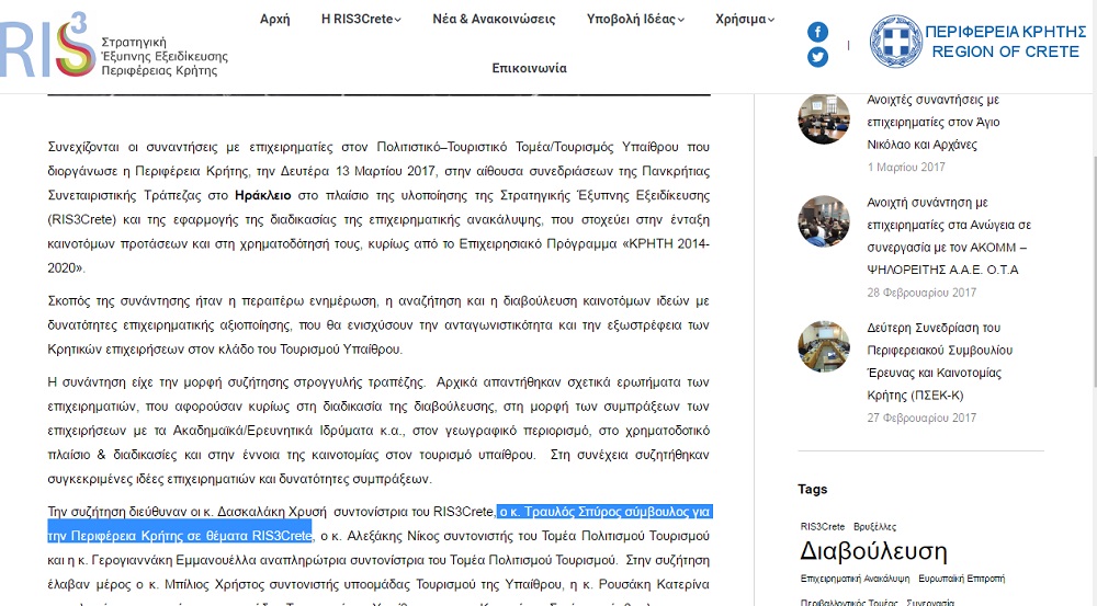 Ο Σπ. Τραυλός, για τον οποίο δεν εντοπίζεται κάποια απόφαση τοποθέτησής του στη “Διαύγεια”, εμφανίζεται, όπως προαναφέραμε, στη σελίδα ris3.crete.gov, δηλαδή την ηλεκτρονική σελίδα της περιφέρειας για την έξυπνη εξειδίκευση, ως σύμβουλος σε θέματα RIS3Crete.