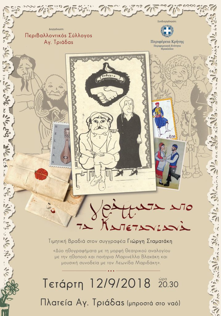 Την Τετάρτη 12 Σεπτεμβρίου 2018 και ώρα 8:30 το βράδυ στην πλατεία της Αγίας Τριάδας (μπροστά στο Ναό), ο Περιβαλλοντικός Σύλλογος Αγίας Τριάδας Ηρακλείου οργανώνει με συνδιοργανωτή την Περιφέρεια Κρήτης- Π.Ε. Ηρακλείου εκδήλωση προς τιμήν του Συγγραφέα – Λαογράφου Γεωργίου Γρηγ. Σταματάκη, κατοίκου της Αγ. Τριάδας. Θα παρουσιαστούν δύο χιουμοριστικά διηγήματα του (Γράμματα από τα Καπετανιανά) σε γνήσια Κρητική διάλεκτο, που θα αποδώσουν σε μορφή θεατρικού αναλογίου η ηθοποιός Μαρινέλλα Βλαχάκη και ο μουσικός Λεωνίδας Μαριδάκης.