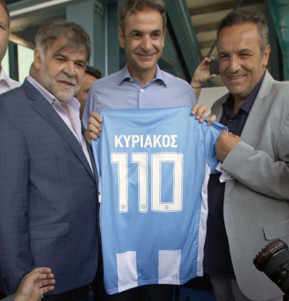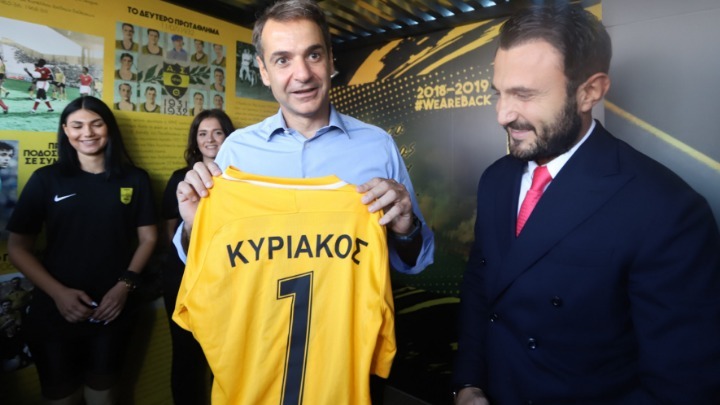 Οι κιτρινόμαυροι του χάρισαν μια φανέλα με το νούμερο 1 και το όνομα Κυριάκος στην πλάτη, με τον πρόεδρο της ΝΔ να αστειεύεται λέγοντας χαρακτηριστικά: “με κάνατε και τερματοφύλακα”.