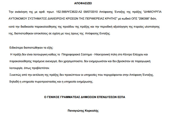 “Δεν χρησιμοποιείτο, δεν ενημερωνόταν και δεν βρισκόταν σε παραγωγική λειτουργία, όπως προβλεπόταν. Συνεπώς από την εκτέλεση της πράξης δεν προκύπτουν οι υπηρεσίες που περιγράφονται στην Απόφαση Ένταξης, δηλαδή η υπηρεσία πυροπροστασίας και η υπηρεσία ενημέρωσης”, αναφέρει η απόφαση ακύρωσης της ένταξης που υπέγραψε ο ΓΓ Δημοσίων Επενδύσεων – ΕΣΠΑ.