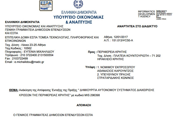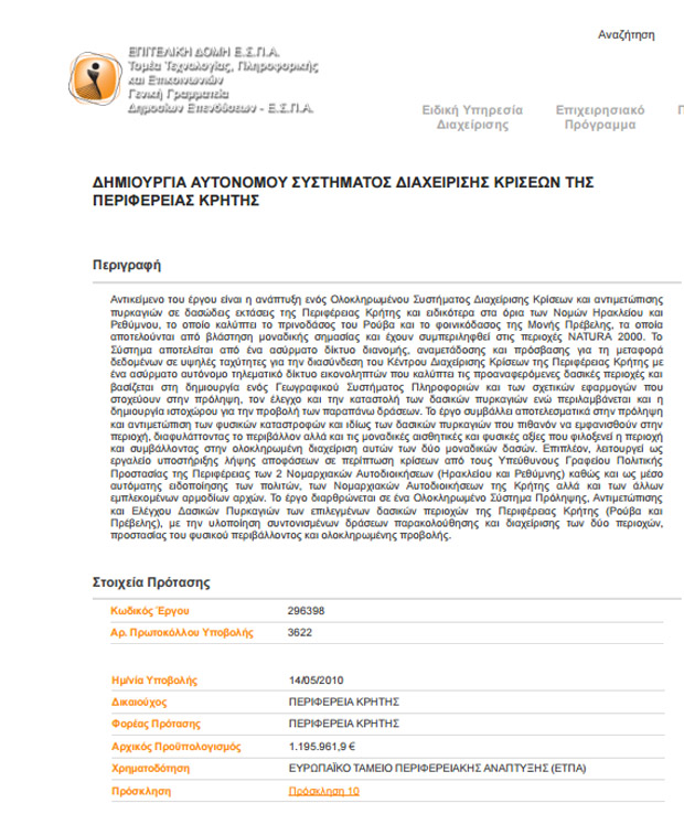 “Επιπλέον– πρόσθετε η απόφαση- λειτουργεί ως εργαλείο υποστήριξης λήψης αποφάσεων σε περίπτωση κρίσεων από τους Υπεύθυνους Γραφείου Πολιτικής Προστασίας της Περιφέρειας των 2 Νομαρχιακών Αυτοδιοικήσεων (Ηρακλείου και Ρεθύμνης) καθώς και ως μέσο αυτόματης ειδοποίησης των πολιτών, των Νομαρχιακών Αυτοδιοικήσεων της Κρήτης αλλά και των άλλων εμπλεκομένων αρμοδίων αρχών. Το έργο διαρθρώνεται σε ένα Ολοκληρωμένο Σύστημα Πρόληψης, Αντιμετώπισης και Ελέγχου Δασικών Πυρκαγιών των επιλεγμένων δασικών περιοχών της Περιφέρειας Κρήτης (Ρούβα και Πρέβελης), με την υλοποίηση συντονισμένων δράσεων παρακολούθησης και διαχείρισης των δύο περιοχών, προστασίας του φυσικού περιβάλλοντος και ολοκληρωμένης προβολής”.
