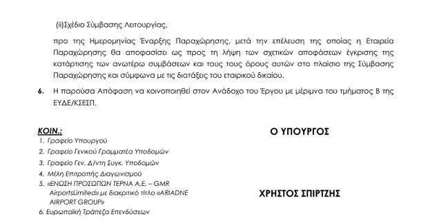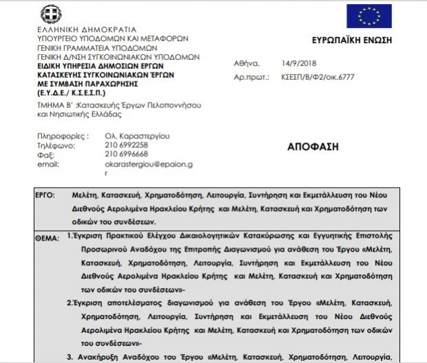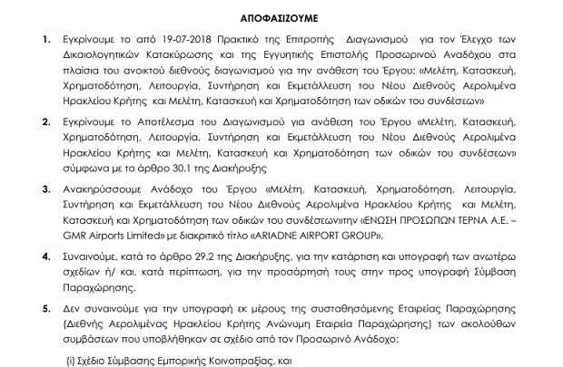 Σύμφωνα με την απόφαση, που δημοσιεύθηκε χθες το βράδυ στη Διαύγεια, «ανακηρύσσουμε Ανάδοχο του Έργου «Μελέτη, Κατασκευή, Χρηματοδότηση, Λειτουργία, Συντήρηση και Εκμετάλλευση του Νέου Διεθνούς Αερολιμένα Ηρακλείου Κρήτης και Μελέτη, Κατασκευή και Χρηματοδότηση των οδικών του συνδέσεων»την «ΕΝΩΣΗ ΠΡΟΣΩΠΩΝ ΤΕΡΝΑ Α.Ε. – GMR Airports Limited» με διακριτικό τίτλο «ARIADNE AIRPORT GROUP». Μετά την απόφαση του υπουργού Υποδομών και την πρόσφατη έγκριση της Ευρωπαϊκής Επιτροπής η σύμβαση παραχώρησης παίρνει το δρόμο για το Ελεγκτικό Συνέδριο. Στη συνέχεια θα πρέπει να εγκριθεί από τη Βουλή προκειμένου στο τέλος να υπογραφεί.