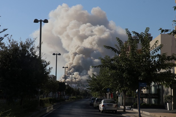 Αποπνικτική είναι η ατμόσφαιρα σε μεγάλη απόσταση από την περιοχή όπου έχει ξεσπάσει η φωτιά, στα παλιά κτίρια του Πανεπιστημίου Κρήτης, στη λεωφόρο Κνωσού.