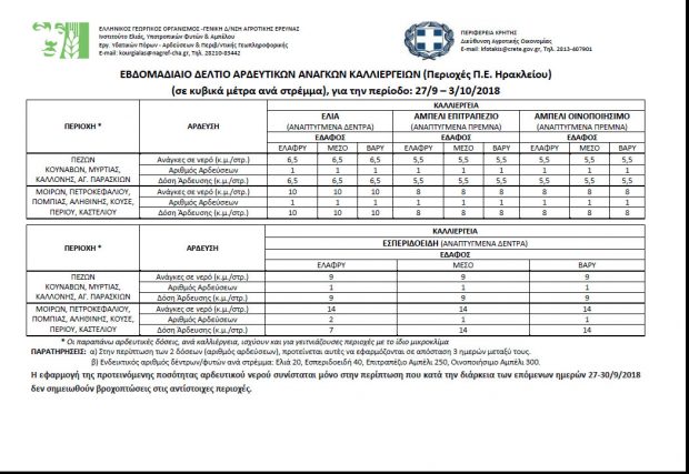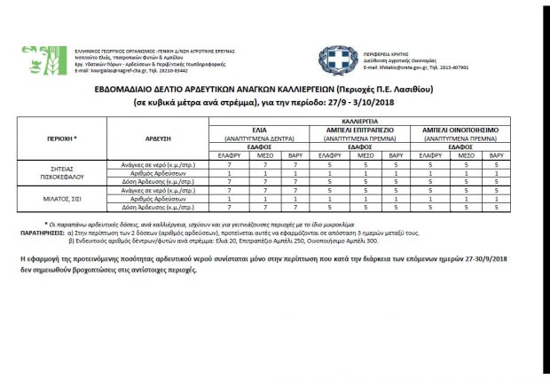 Στις περιοχές των Π.Ε. Ηρακλείου & Λασιθίου για τις οποίες εκδίδονται τα εβδομαδιαία αρδευτικά δελτία η εφαρμογή της προτεινόμενης ποσότητας αρδευτικού νερού (συνημμένα αρχεία) συνίσταται μόνο στην περίπτωση που κατά την διάρκεια των επόμενων ημερών 27-30/9/2018 δεν σημειωθούν βροχοπτώσεις στις αντίστοιχες περιοχές.