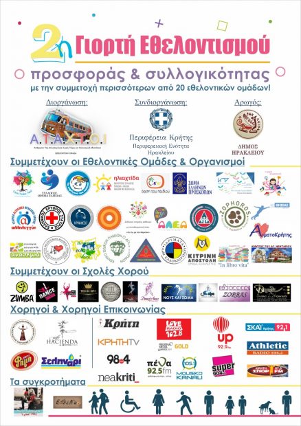 Πάνω από 25 Εθελοντικές ομάδες-Οργανισμοί και φορείς της πόλης μας, θα βρίσκονται μαζί μας. Κύριο μέλημα μας να έρθουν οι πολίτες του Ηρακλείου σε επαφή με τις Εθελοντικές ομάδες να μάθουν το έργο τους, και πως μπορούν οι ίδιοι οι πολίτες να προσφέρουν αλλά να γίνουν και αυτοί ενεργοί εθελοντές. Στόχος μας επίσης είναι και όλες οι ομάδες να έρθουν πιο κοντά και η μία στην άλλη, να γνωρίσουν το έργο αλλά και να ανταλλάξουν απόψεις.