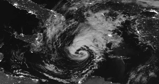 Μια εντυπωσιακή φωτογραφία, όπου φαίνεται καθαρά η δομή του μεσογειακού κυκλώνα, αποτύπωσε ο δορυφόρος της Αμερικανικής Διαστημικής Υπηρεσίας (NASA) Suomi NPP στις 03:50 ώρα Ελλάδος το Σάββατο.