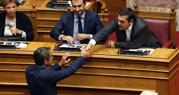Λίγο πριν από τον αγιασμό από τον Αρχιεπίσκοπο Ιερώνυμο για την έναρξη της Δ’ Συνόδου της ΙΖ Περιόδου της Βουλής, ο Πρωθυπουργός Αλέξης Τσίπρας και ο Πρόεδρος της ΝΔ Κυριάκος Μητσοτάκης, είχαν έναν σύντομο διάλογο στα κυβερνητικά έδρανα εν όψει της νέας κοινοβουλευτικής περιόδου.