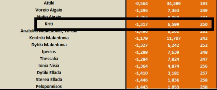 Με βάση τον δείκτη περιφερειακής ανταγωνιστικότητας (RCI), που δημοσιεύεται ανά τριετία, η περιφέρεια Κρήτης βρίσκεται στην 250η θέση ανάμεσα σε σε 263 Περιφέρειες της Ευρωπαϊκής Ένωσης. Τη σχετική έκθεση για την τριετία 2014- 2016 δημοσίευσε η Κομισιόν και η Κρήτη δεν είναι όχι στην κορυφή της Ευρώπης, όπως για χρόνια ακούμε, αλλά ούτε καν της Ελλάδας… Βρίσκεται στη μέση ακριβώς των 13 περιφερειών, δηλαδή στην 7η θέση, και στην 250η στις 263 ευρωπαϊκές περιοχές.