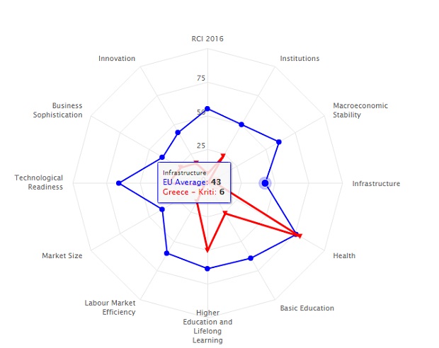 Και μόνο ένας από τους δείκτες, αυτός των υποδομών, δίνει εξήγηση για την θέση του νησιού: οι υποδομές ο δείκτης της Κρήτης είναι μόλις 6, με τον ευρωπαϊκό να φτάνει στο 43…