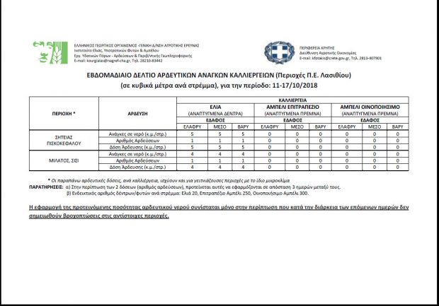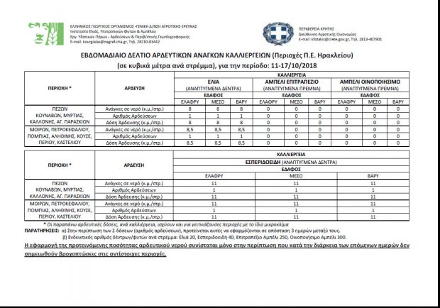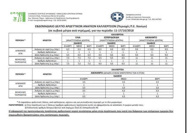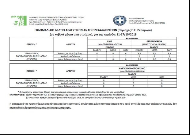 Ανακοίνωση εξέδωσε η Διεύθυνση Αγροτικής Οικονομίας της Περιφέρειας Κρήτης, μέσω της οποίας παρουσιάζει τα αρδευτικά δελτία και των τεσσάρων νομών της Κρήτης για την εβδομάδα από 11/10 έως 17/10/2018.