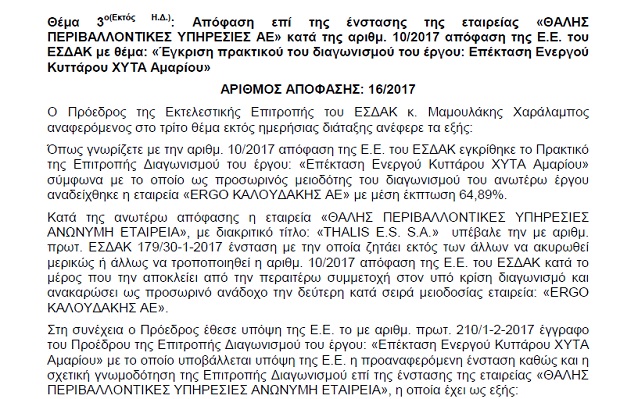 Στις 30 Ιανουαρίου 2017 ο “Θαλής” προχώρησε σε ένσταση, υποστηρίζοντας ότι είναι επουσιώδης λόγος ο ανοικτός φάκελος στον οποίο υπήρχαν τα δικαιολογητικά της συμμετοχής του.