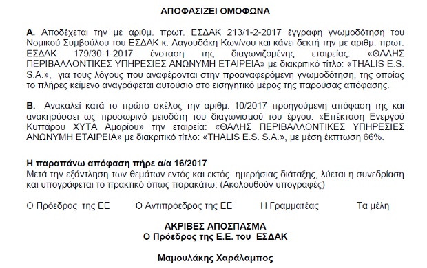 Αυθημερόν η ΕΕ του ΕΣΔΑΚ αλλάζει, ομόφωνα μάλιστα, την αρχική- επίσης ομόφωνη- απόφασή της και ανακηρύσσει μειοδότη τον “Θαλή”.
