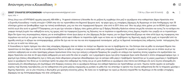 Κ.Κουκιαδακη το πρώτο πράγμα που κάνει ένας υποψήφιος Δήμαρχος είναι να πιάσει τον παλμό των δημοτών του και τα προβλήματα του. Και δεύτερο είναι να μάθει τα εσωτερικά θέματα που προκύπτουν σε ένα Δήμο και ποσό δε στην καθαριότητα,Πρεπει να έρθει σε επαφή με το αντικείμενο κάθε μιας υπηρεσίας ξεχωριστά.Να γνωριζει τι προσωπικό έχει,και να σπάσει αυγά με την εκάστοτε κυβέρνηση και να κάνει προσληψης μόνιμου προσωπικού όπου τους έχει ανάγκη η υπηρεσία. Προφανως δεν γνωρίζει οτι υπάρχει ένα τεραστιος στολος οχημάτων στο αμαξοστάσιο του Δήμου Ηρακλείου και είναι σε 24 ώρη κίνηση καθημερινά,για αυτο καλό θα είναι να γνωρίζει και τι μηχανήματα έργου έχει,(στην περιφειρια ξερει καλά ιδιωτικά) τι στόλο απορριμματοφόρων έχει ,τι φορτηγά έχει,πόσους οδοκαθαριστές έχει η πόλη μας,ποσα οδομετρικα χιλιομετρα οδοκαθαρισμου έχει να καλύψει κάθε μέρα,τι προβλήματα προκύπτουν με τις μικρες χωματερες,τι προβλήματα έχουν οι εργαζόμενοι που δίνουν με το καλύτερο τρόπο την μάχη στον καθαρισμό της πολης και με οτι μεσα διαθέτουν,οι εργαζόμενοι είναι πάντα εκεί 24/24ωρο είτε αυτο λέγεται αποκομιδή,είτε ανακύκλωση,είτε οδοκαθαρισμος, είτε ξεμπάζωμα από διαφορες συνοικιες όλοι οι εργαζόμενοι θελουμε ένα καθαρό Ηράκλειο και προσπαθούμε για αυτο. Πρωτου λοιπόν αρχίσει να εκστομίζει κορόνες περί ιδιωτικής πρωτοβουλίας για την καθαριότητα στα μεσα μαζικης ενημερωσης,ας ρωτήσει να μάθει.Και του απαντάμε το (φιλέτο που λέγεται καθαριότητα) δεν θα το πληρώσει χρυσάφι ο δημοτης Ηρακλείου για να γίνει πλουσιος ο ιδιωτης)Και μια ερώτηση κλεινοντας μήπως θα λύσει και το πρόβλημα του νερού με ιδιωτική εταιρεία?θα του θυμίσουμε οτι θα κατέβει υποψήφιος Δήμαρχος και οχι Αντιπεριφερειάρχης που είναι γαντζωμένος”.