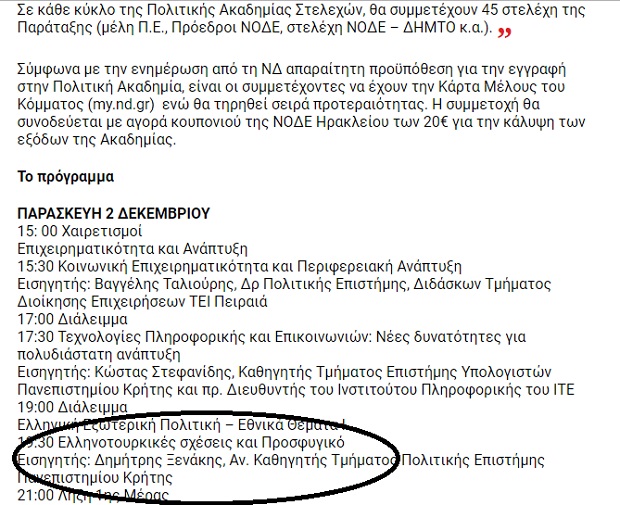 Κι ενώ ο καθηγητής έχει τόσο στενή σχέση με τη ΝΔ και τον Αυγενάκη, ώστε μπορεί να είναι σε εκείνους που εκπαιδεύουν τα κομματικά στελέχη, κλείνει συμφωνία με τον Σταύρο Αρναουτάκη για υποψηφιότητα μαζί του! Είναι η περίοδος που ο κ. Αρναουτάκης “παίζεται” από τον βουλευτή Ηρακλείου της ΝΔ ως υποψήφιος περιφερειάρχης του κόμματος της αξιωματικής αντιπολίτευσης.